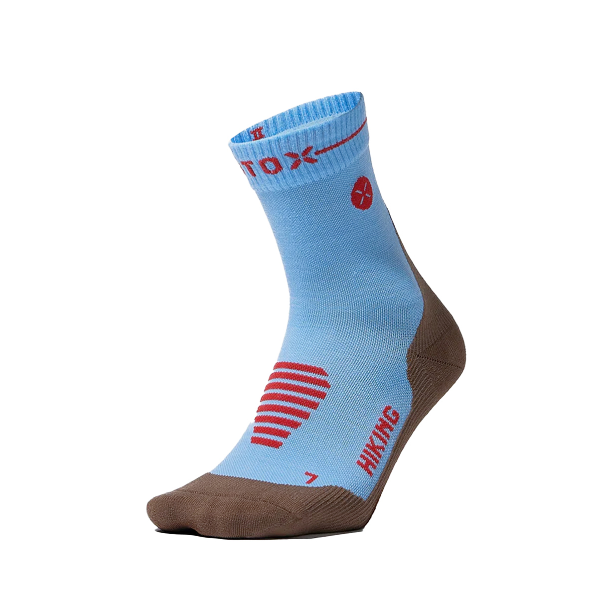 STOX Hiking enkel Outdoor Trail wandel sokken (Lichtblauw/Bruin) voor dames zijn enkel compressiekousen met thermoregulerend Merino wol erin verwerkt. Ze hebben gerichte compressie om de enkelstabiliteit op ruig terrein te verbeteren.