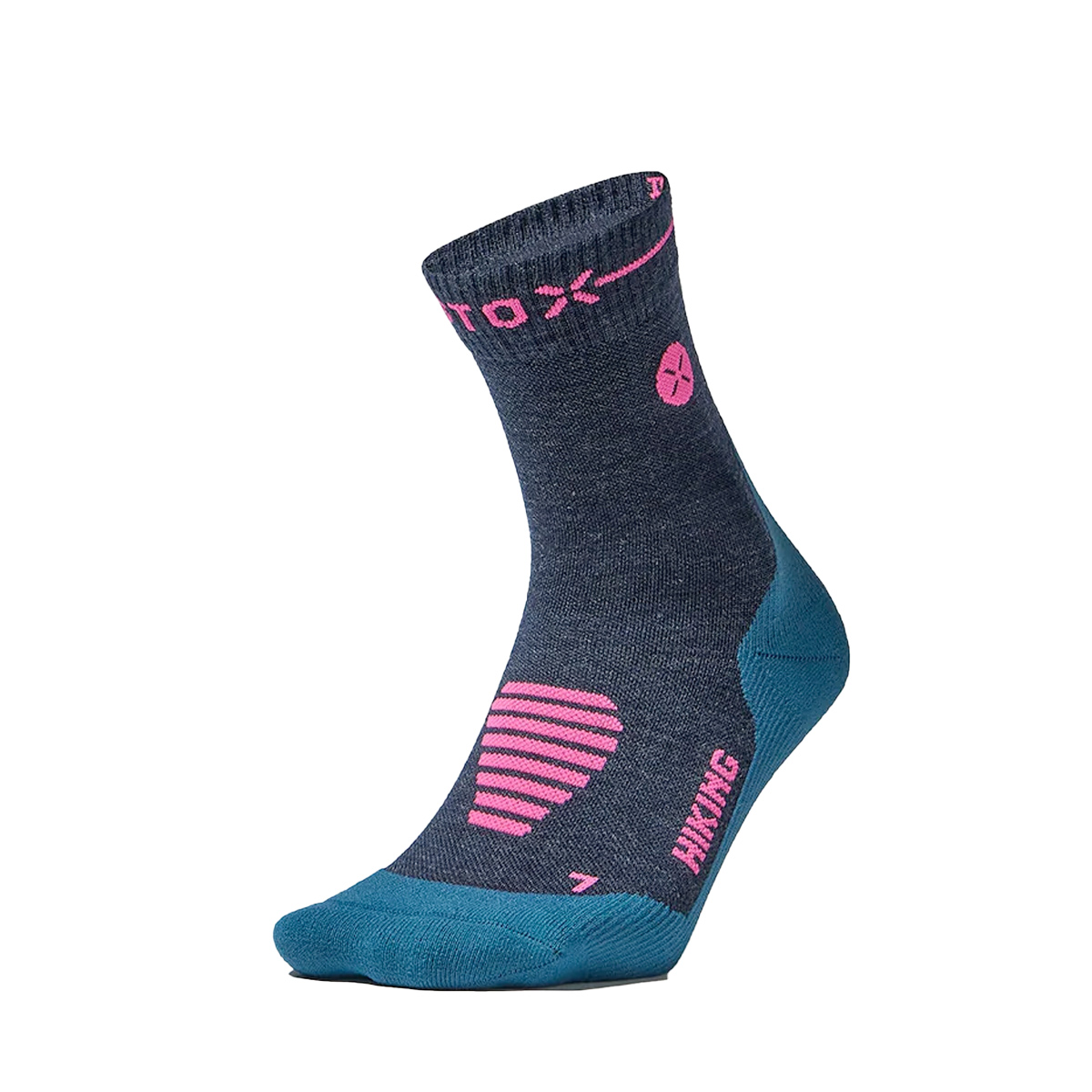 STOX Hiking enkel Outdoor Trail wandel sokken (Blauw/Roze) voor dames zijn enkel compressiekousen met thermoregulerend Merino wol erin verwerkt. Ze hebben gerichte compressie om de enkelstabiliteit op ruig terrein te verbeteren.