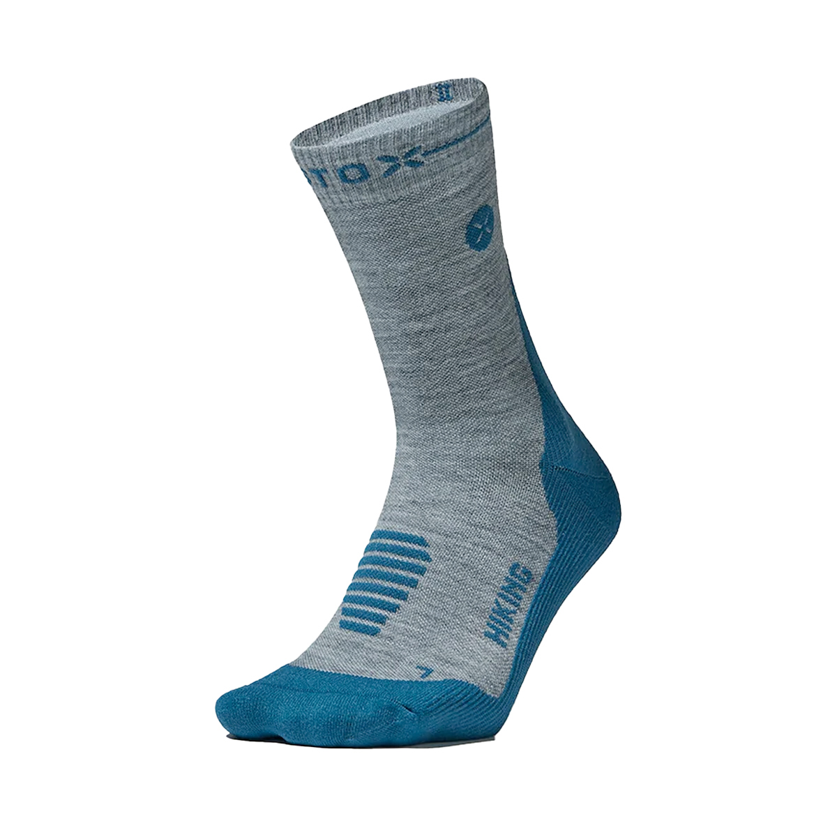 STOX Hiking enkel Outdoor Trail wandel sokken (Zilvergrijs/Blauw) voor heren zijn enkel compressiekousen met thermoregulerend Merino wol erin verwerkt. Ze hebben gerichte compressie om de enkelstabiliteit op ruig terrein te verbeteren.
