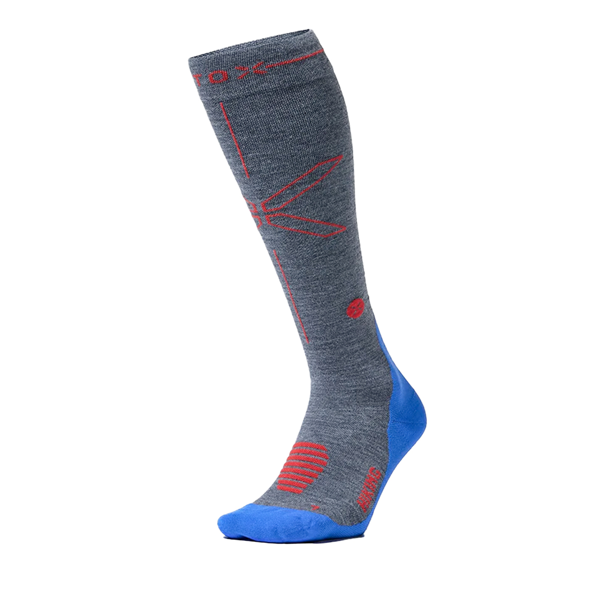 STOX Hiking Outdoor Trail wandel sokken (Grijs/Cobalt) voor heren zijn hoge compressiekousen met thermoregulerend Merino wol erin verwerkt. Deze sportsokken helpen blaren voorkomen en verlichten de belasting, ze stimuleren de bloedsomloop om vermoeidheid kramp te verminderen.