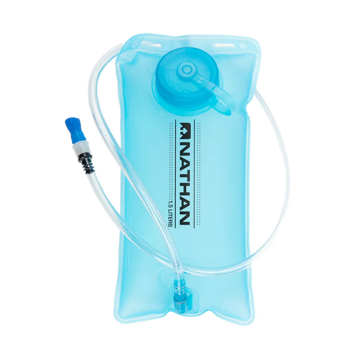 De Nathan waterzak Quickstart Hydration 1,5L met hogestroom-bijtventielen en een grote, gemakkelijk te vullen schroefdopopening voor eenvoudig schoonmaken en snelle installatie. Afneembare flexibele slang, eenvoudig los te schroeven van de blaas voor reiniging.