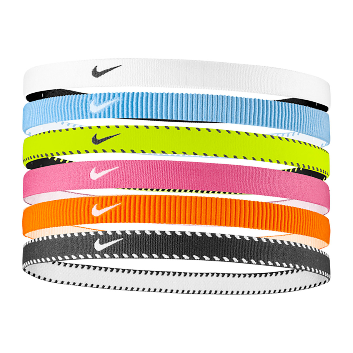 Deze Nike haarband Flex 6-pack (Volt/Vivid Pink/White) is gemaakt van elastische polyester stof en zorgt ervoor dat je haar niet voor je ogen hangt tijdens het sporten. De siliconen anti-slip randen houden de band goed op zijn plek.