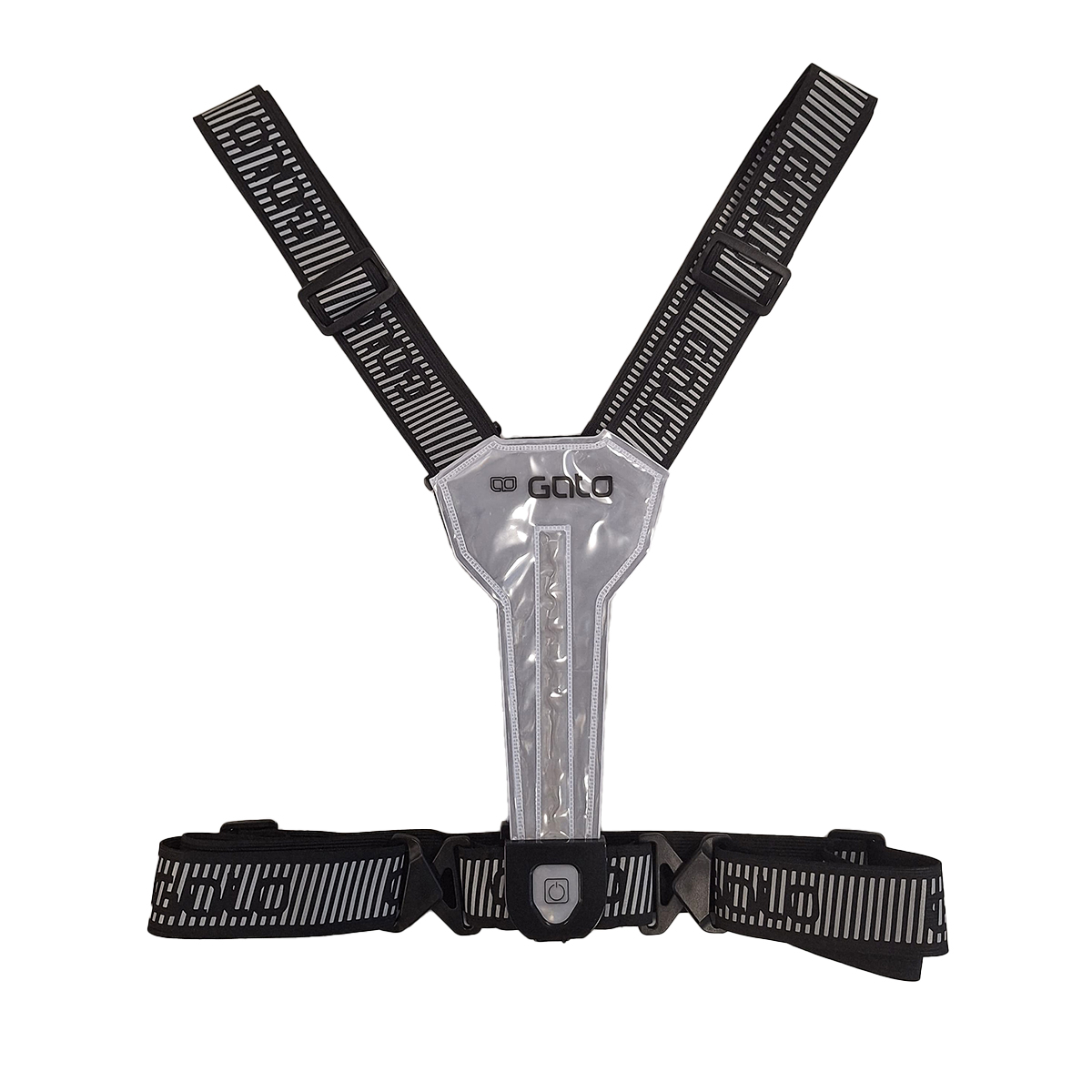 De schouderbanden zijn ruim verstelbaar en elastisch, ze zullen je tijdens je run niet belemmeren, en ze zijn voorzien van brede reflecterende banden. Op de voor- en achterzijde zit midden op de borst en rug een LED-strip die oplaadbaar is d.m.v bijgeleverd oplaadsnoer. Deze is d.m.v. een druk op de knop in twee verschillende standen te zetten en is continu en strobo-langzaam.