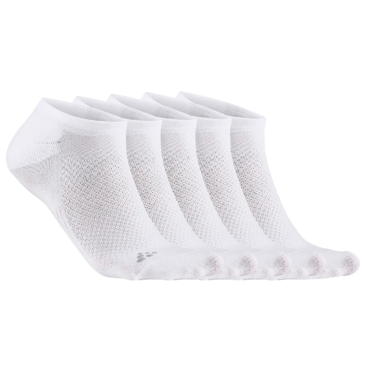Deze Craft 5 paar Core Dry Footies white hardloopsokken zijn functionele dunne sportsokjes die net onder de schoenen zitten met uitstekende vochttransport en voldoende ventilatie. Ondersteuning van de voetholte, platte teennaden en versterkte teen en hiel.