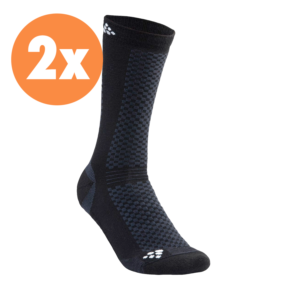 De functionele Craft sok Wool Warm Mid black 2 paar met groot vochttransport en elastische voetholtebeschermer. Ondanks dat de sokken veel warmte bieden hebben de sokken ook nog een hoog ademend vermogen, waardoor vocht snel en effectief wordt afgevoerd. De sok is voorzien van strategisch geplaatste drukpunten, waardoor de sokken enorm comfortabel zitten. Deze verpakking bevat twee paar sokken