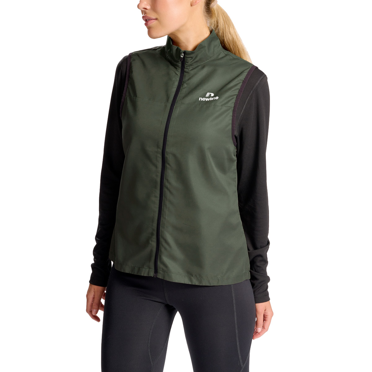 Newline hardloopjas zonder mouwen nwlBEAT green voor dames houdt je droog en comfortabel tijdens je trainingen in het voorjaar en najaar. Een bodywarmer met een hoge kraag en uitstekende winddichte en waterafstotende eigenschappen. Deze veelzijdige top heeft een ritssluiting aan de voorkant en een handig kleine achterzak met rits voor je kleine spullen. Het biedt een comfortabele en functionele pasvorm met elastische binding bij de armen. Op de voorkant bevindt zich een bedrukt logo en op de achterkant een print voor een verhoogde zichtbaarheid.
