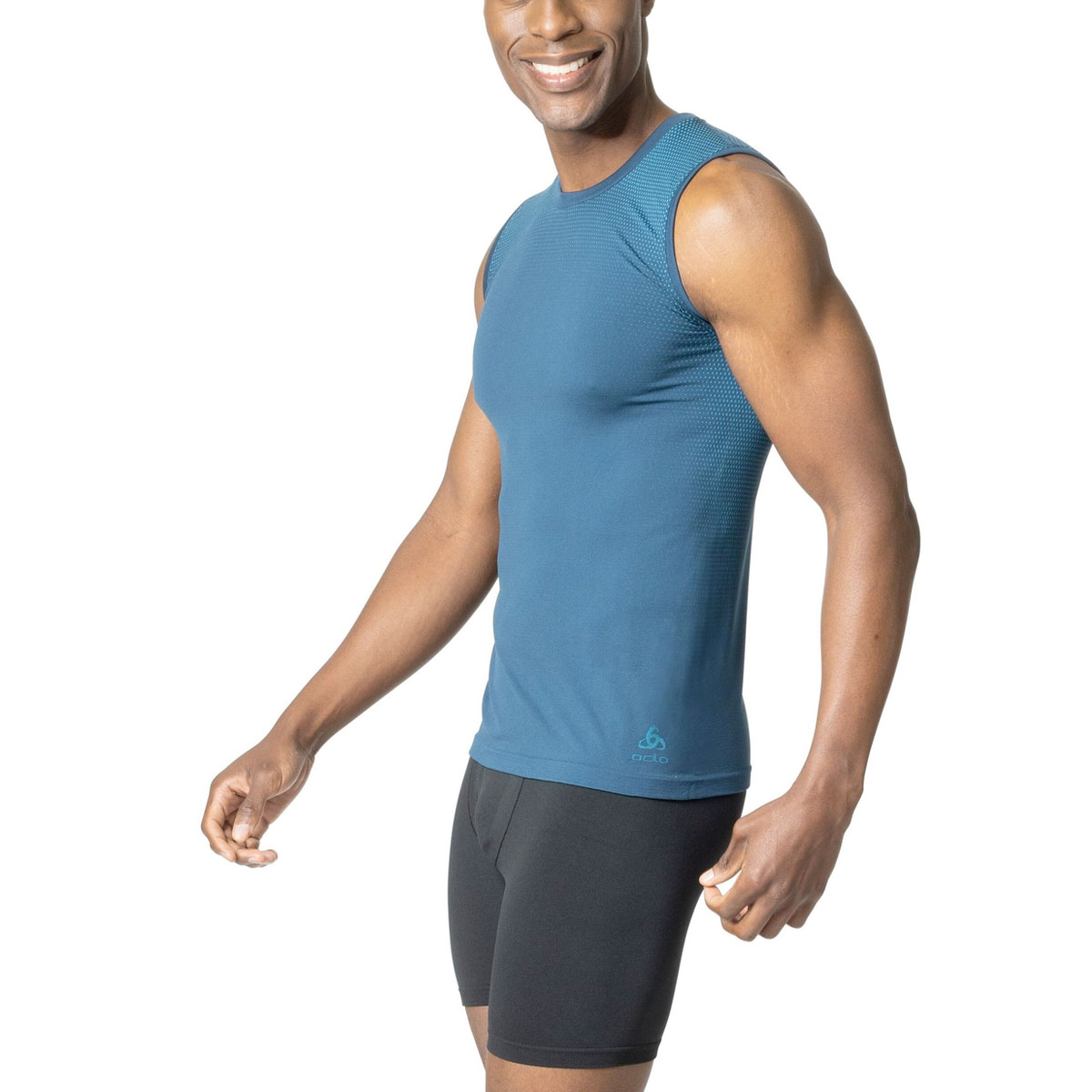 Dit Odlo singlet Performance Light Eco Blue Wing Teal - Saxony Blue voor heren is naadloos en heeft een betere pasvorm. Extra ademend vermogen en is behandeld met ZeroScent, een bio-based anti-microbiële afwerking die geurtjes en de ophoping van bacteriën beperkt.