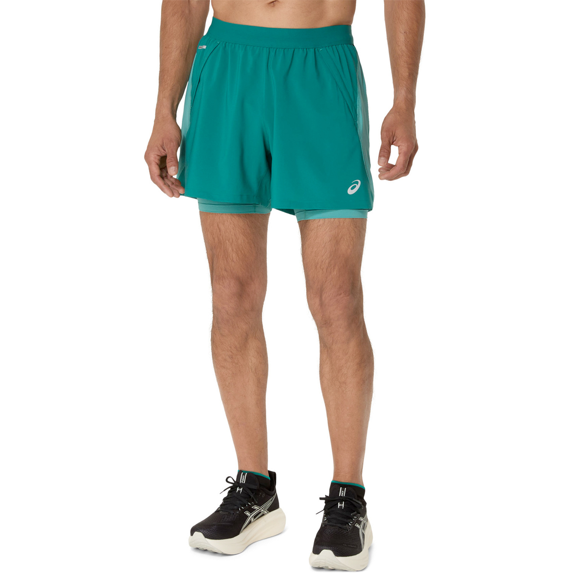 Asics 2-in-1 Road Short 5-inch (Rainy Lake/Light Teal) heren combineert een losse hardloopshort met een geïntegreerde binnentight en telefoonzak. De tailleband is voorzien van een verstelbaar trekkoord voor een persoonlijke pasvorm, en aan de achterkant bevindt zich een ritszakje, ideaal voor je telefoon of andere essentials.