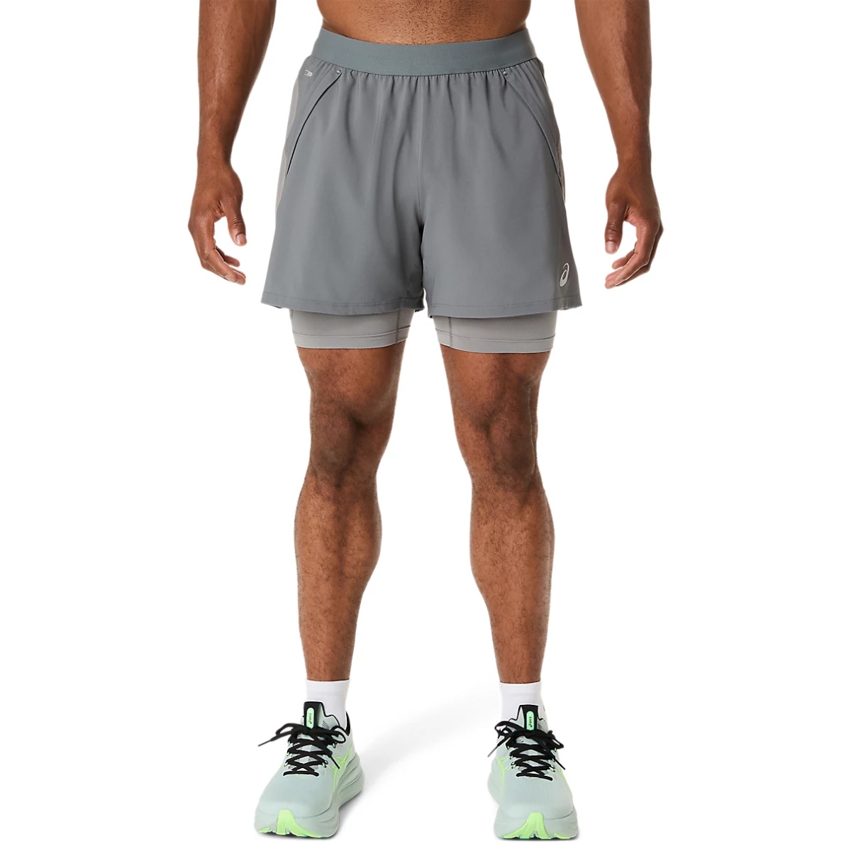Asics 2-in-1 Road Short 5-inch (Clay Grey/Steel Grey/Illuminate Green) heren combineert een losse hardloopshort met een geïntegreerde binnentight en telefoonzak. De tailleband is voorzien van een verstelbaar trekkoord voor een persoonlijke pasvorm, en aan de achterkant bevindt zich een ritszakje, ideaal voor je telefoon of andere essentials.