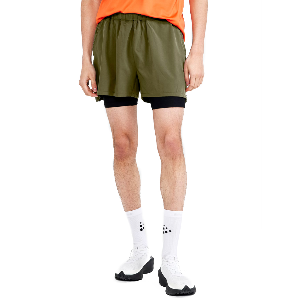 Craft 2-in 1 short Adv Essence Stretch rift groen heren is een comfortabele wijdere sportbroek met strakke binnentight. Deze sportshort is sneldrogend en biedt optimale bewegingsvrijheid. Er zit een klein sleutelzakje in en heeft een aanrijgkoord. De short is voorzien van 2 steekzakken zonder rits en een telefoonzak waarin ook een gelletje of drinkflesje opgeborgen kan worden.