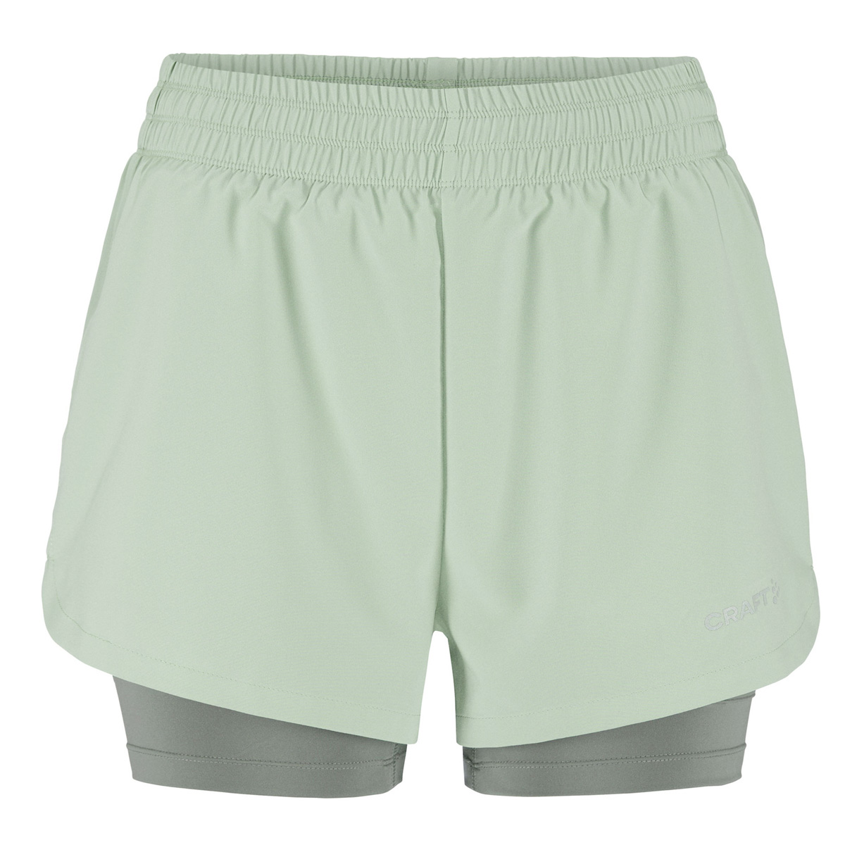 Craft ADV Essence 2-in-1 Shorts 2 (Glacial) dames is een functionele hardloopshort incl. strakke tight eronder met telefoonvak. Deze mee bewegende hardloop broek voor dames is gemaakt van geweven stretchstof die ademend is en razendsnel warmte en vocht afvoert.