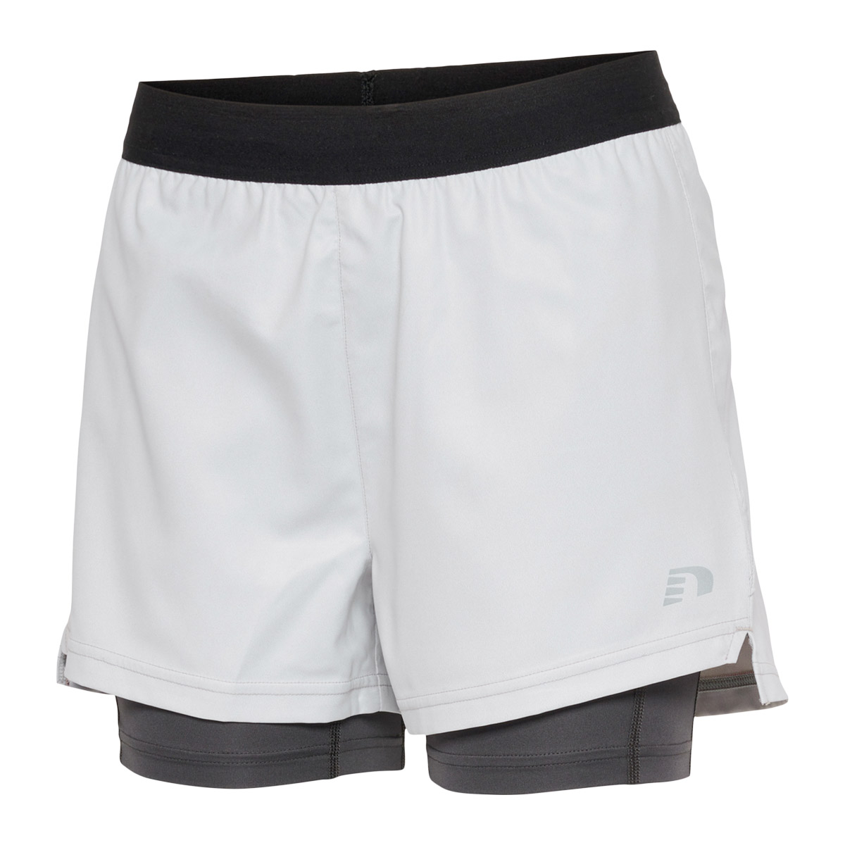 Newline hardloop short 2-in 1 Running oyster / mushroom dames heeft een rekbare korte strakke halftight als binnenbroekje die iets langer valt dan de losse short. De ademende en sneldrogende buitenste damesshort is gemaakt met elastische trekkoord…