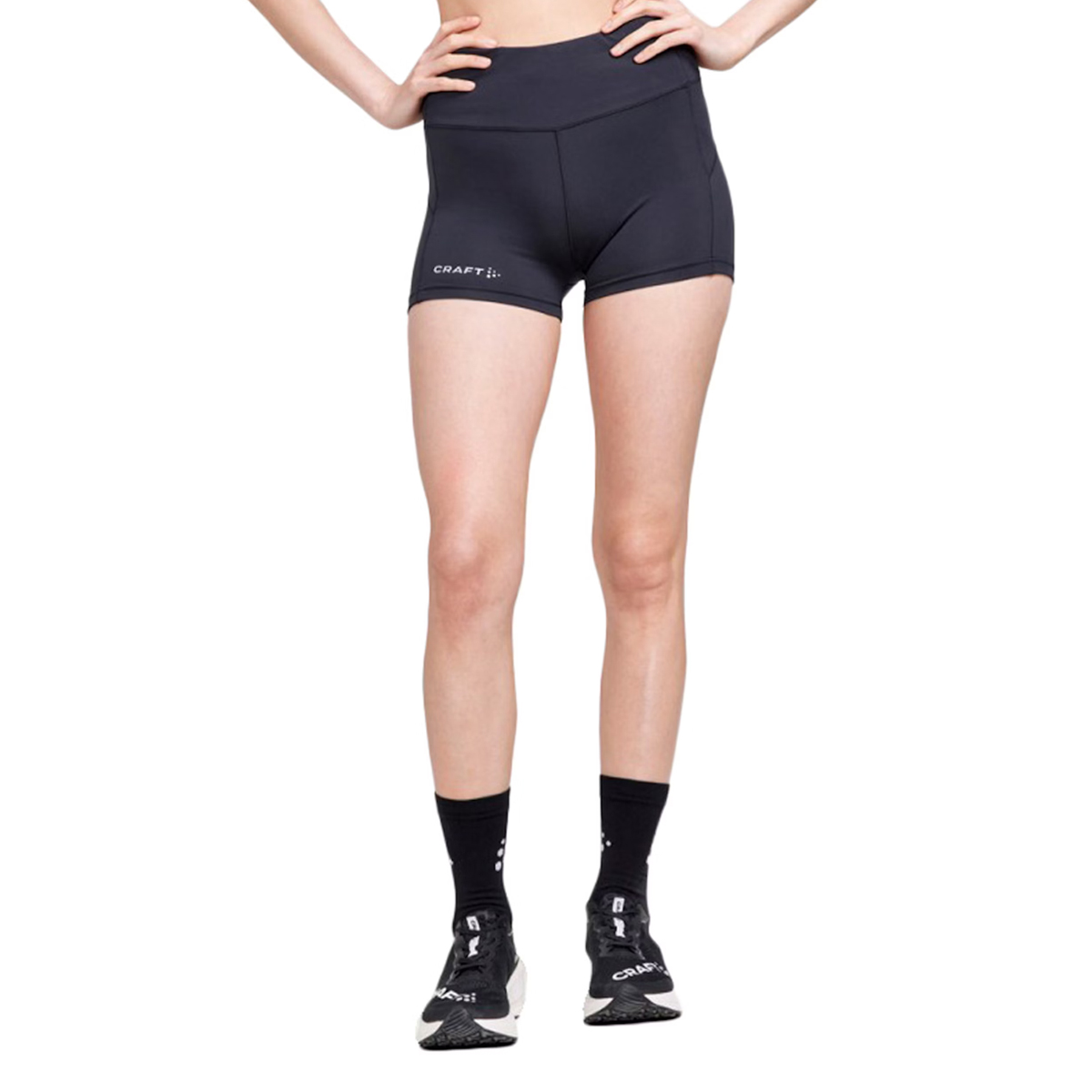 Craft korte tight Hot Pants (Black) voor de dames is een korte strakke sportbroek gemaakt van zacht stretchy materiaal. Een opbergvakje aan binnenzijde van de taille en extra sleutelzakje maken het tot een gewild item in de zomer onder hardloopsters!