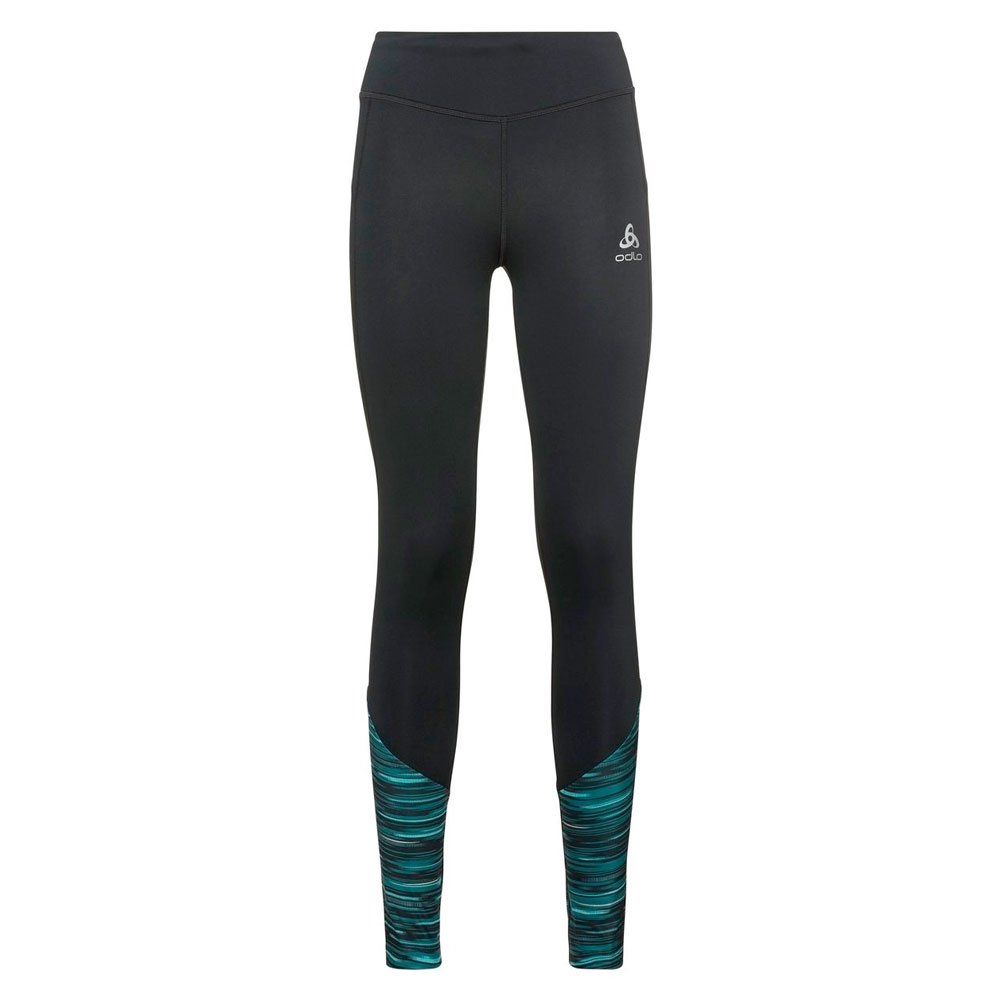 Deze Odlo lange tight Zeroweight Reflective black/wine tasting blauwe print op de kuiten voor dames met reflecterende details is comfortabel en gemaakt van zachte ademende stof. Deze strakke hardloopbroek heeft een sleutelzakje met rits.