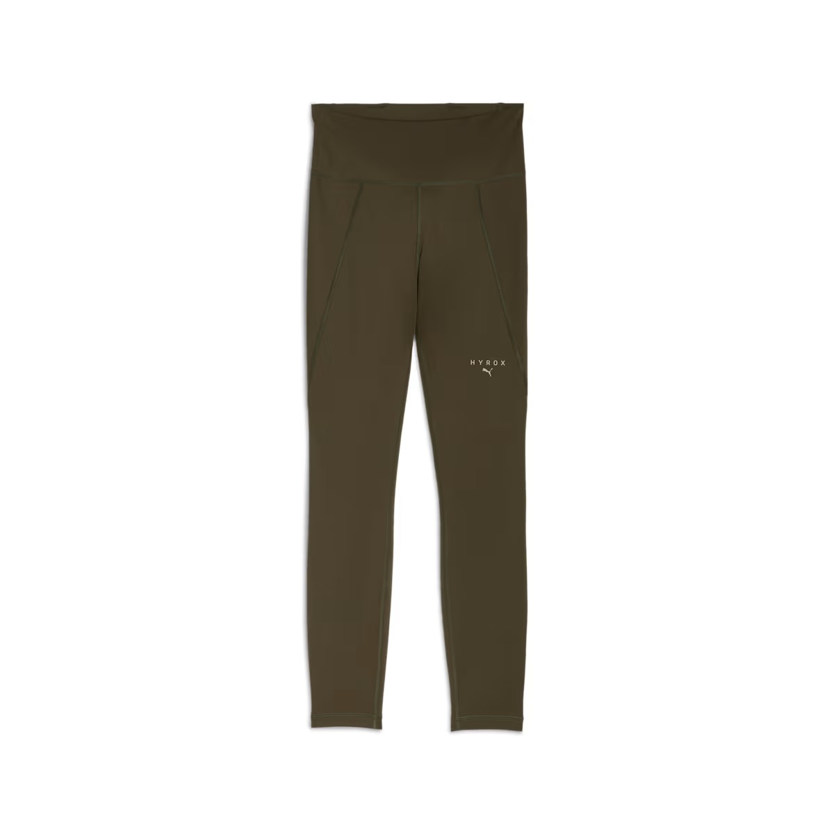 Verbeter je trainingen met de Puma lange tight x HYROX Essential (Dark Olive) dames met hoge tailleband waar een telefoon of gelletje aan de achterzijde kan worden ingeschoven.
