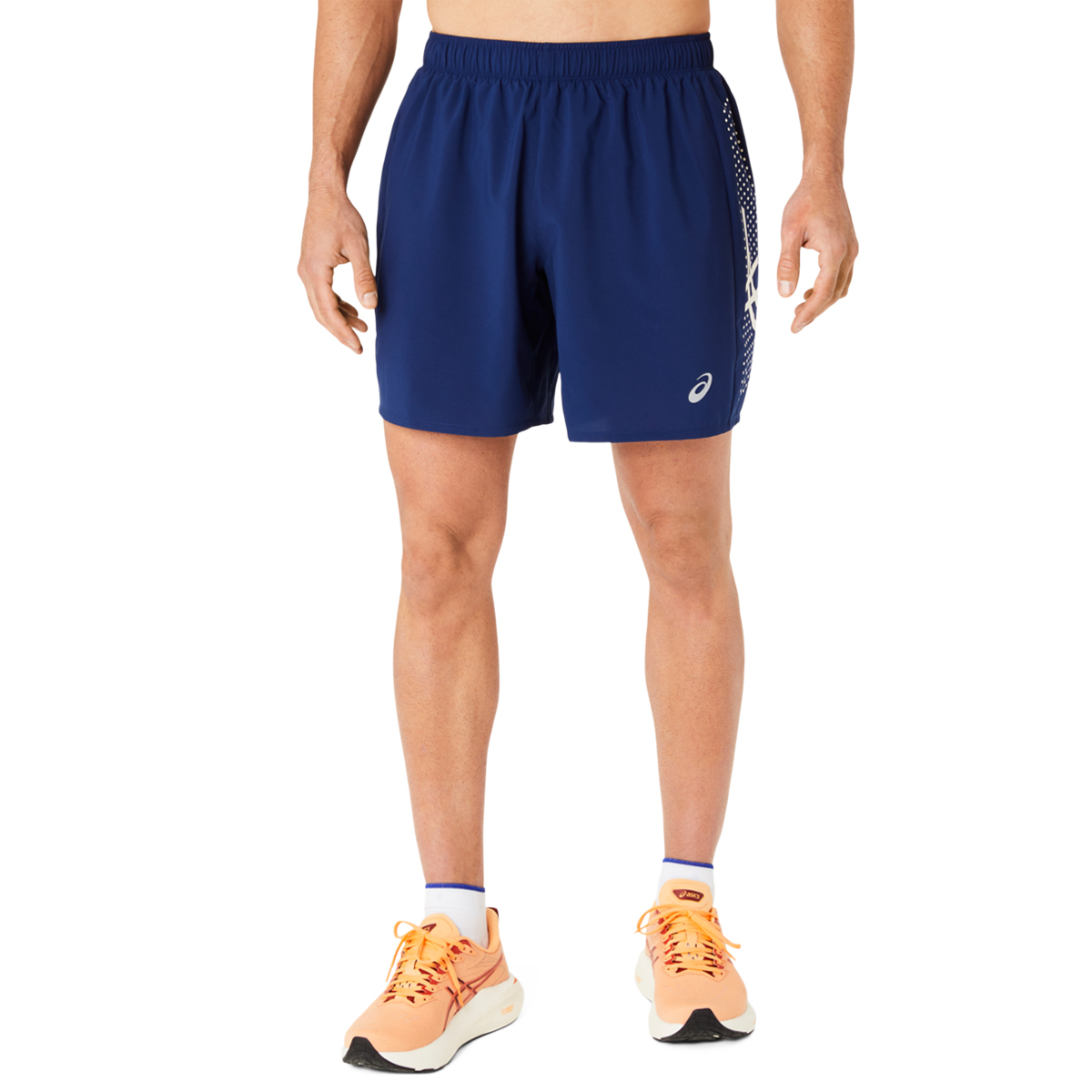 De Asics short Icon 7-inch (Blue Expanse/Birch) voor heren is gemaakt van een lichtgewicht stof die is uitgerust met effectieve vochtafvoerende eigenschappen. Deze Asics sport short heeft een trekkoord in de taille voor een verstelbare pasvorm.
