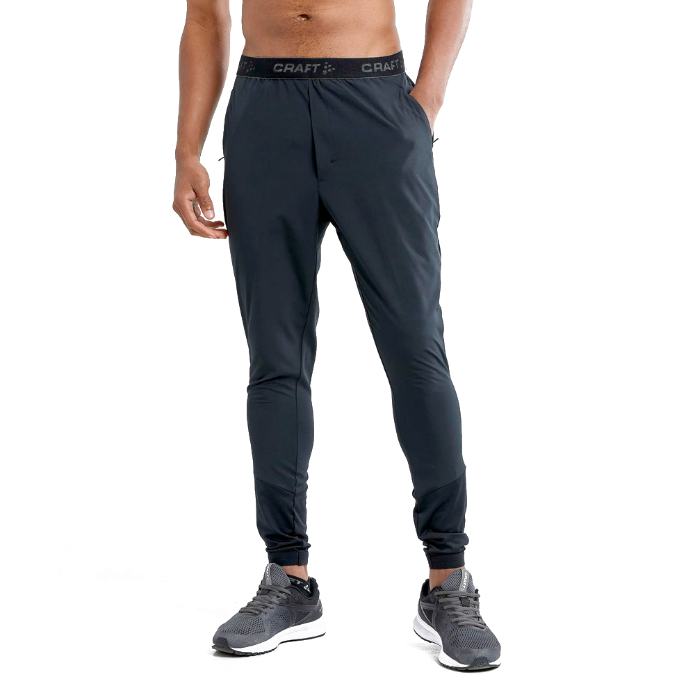 Craft trainings pant Adv Essence black heren is gemaakt van gerecycled polyester die voldoende mee beweegt tijdens hardlopen of andere intensieve sporten als fietsen, roeien, schaatsen en wandelen.