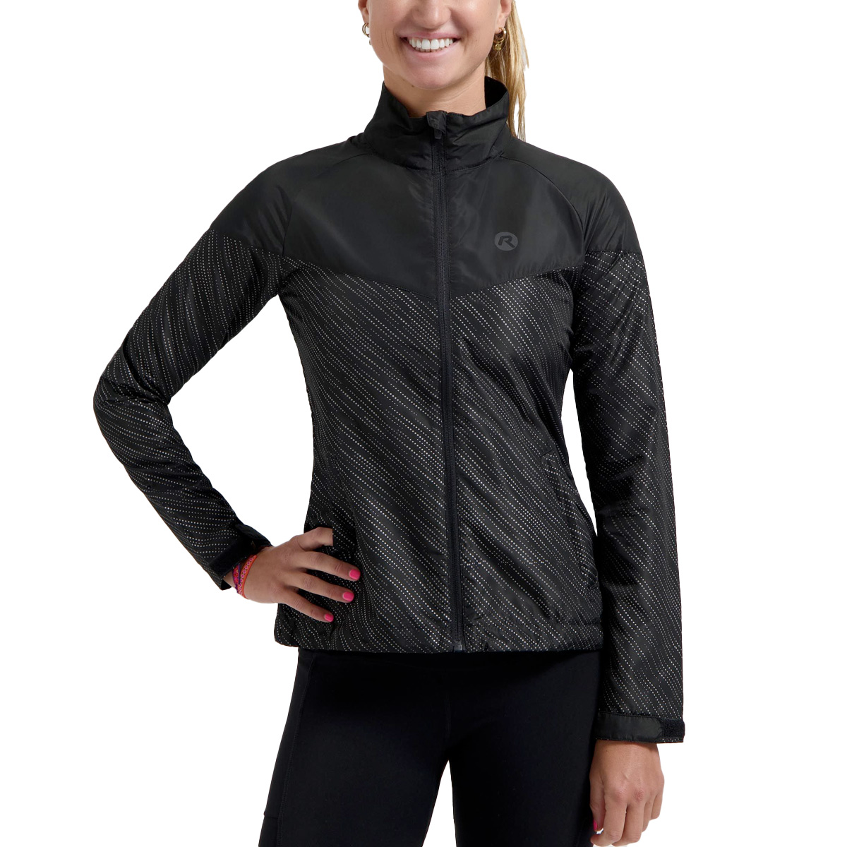 Dit Rogelli jack Hi Vis black voor dames is gemaakt van winddichte Eco Airbloc-stof voor duurzaamheid en bescherming. De reflecterende all-over print biedt 360 graden zichtbaarheid bij weinig licht. Een ventilatieopening aan de achterkant houdt je koel, terwijl de verstelbare polssluitingen en tailleband voor een perfecte pasvorm zorgen.