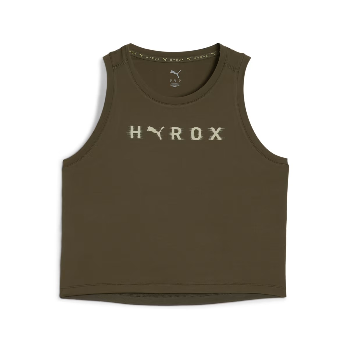 Puma tank top x HYROX Cloudspun (Dark Olive) dames is een kort vallende sportsinglet gemaakt van een mix van hoogwaardige ademende stoffen (deels gerecycled), die zacht en comfortabel aanvoelen.