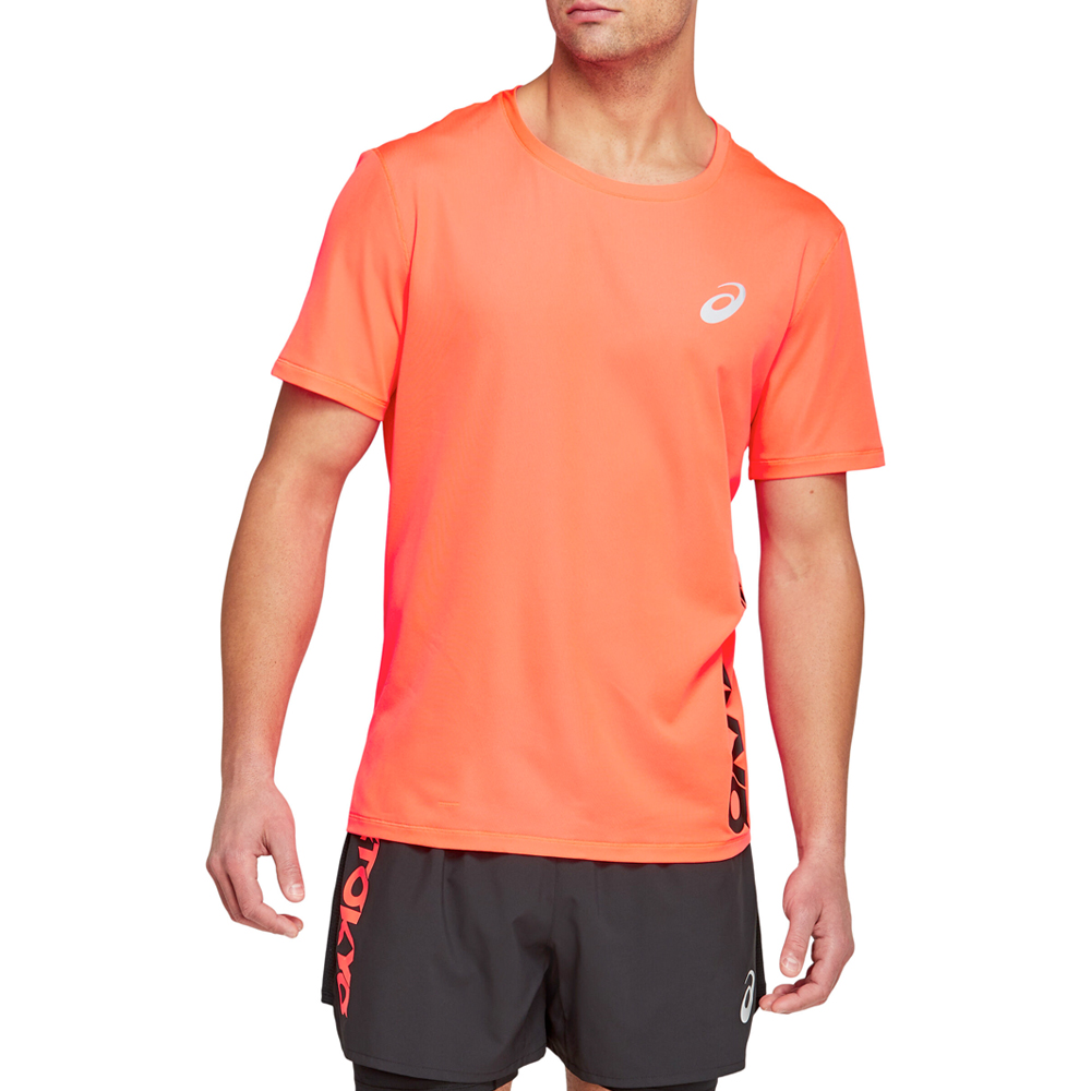 Dit Asics shirt korte mouw Future Tokyo Ventilate sunrise red voor heren, symbolisch voor de gebouwen van Tokyo, neonverlichting en de toewijding om vooruitgang te boeken in prestatietechnologie.