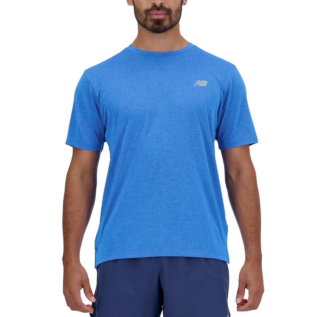 New Balance shirt korte mouw Athletic blue oasis heather heren houdt je droog en comfortabel tijdens je dagelijkse hardlooptrainingen. New Balance hardloopshirt is aansluitend en gemaakt van een lichtgewicht en ademende gerecyclede polyester stof.