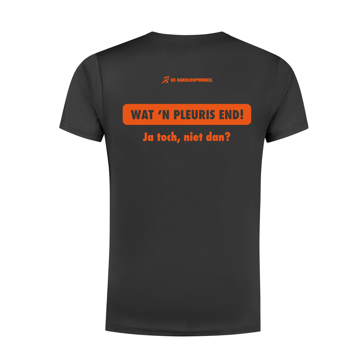Een uniek sneldrogend hardloopshirt van Rogelli voor de heren met de tekst: 'Wat 'n pleuris end. Ja toch, niet dan?'