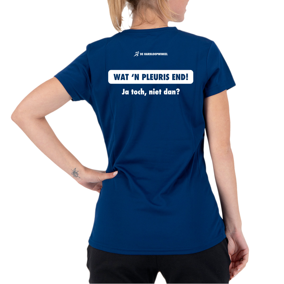 Een uniek sneldrogend hardloopshirt van Rogelli voor de dames met de tekst: 'Wat 'n pleuris end. Ja toch, niet dan?'