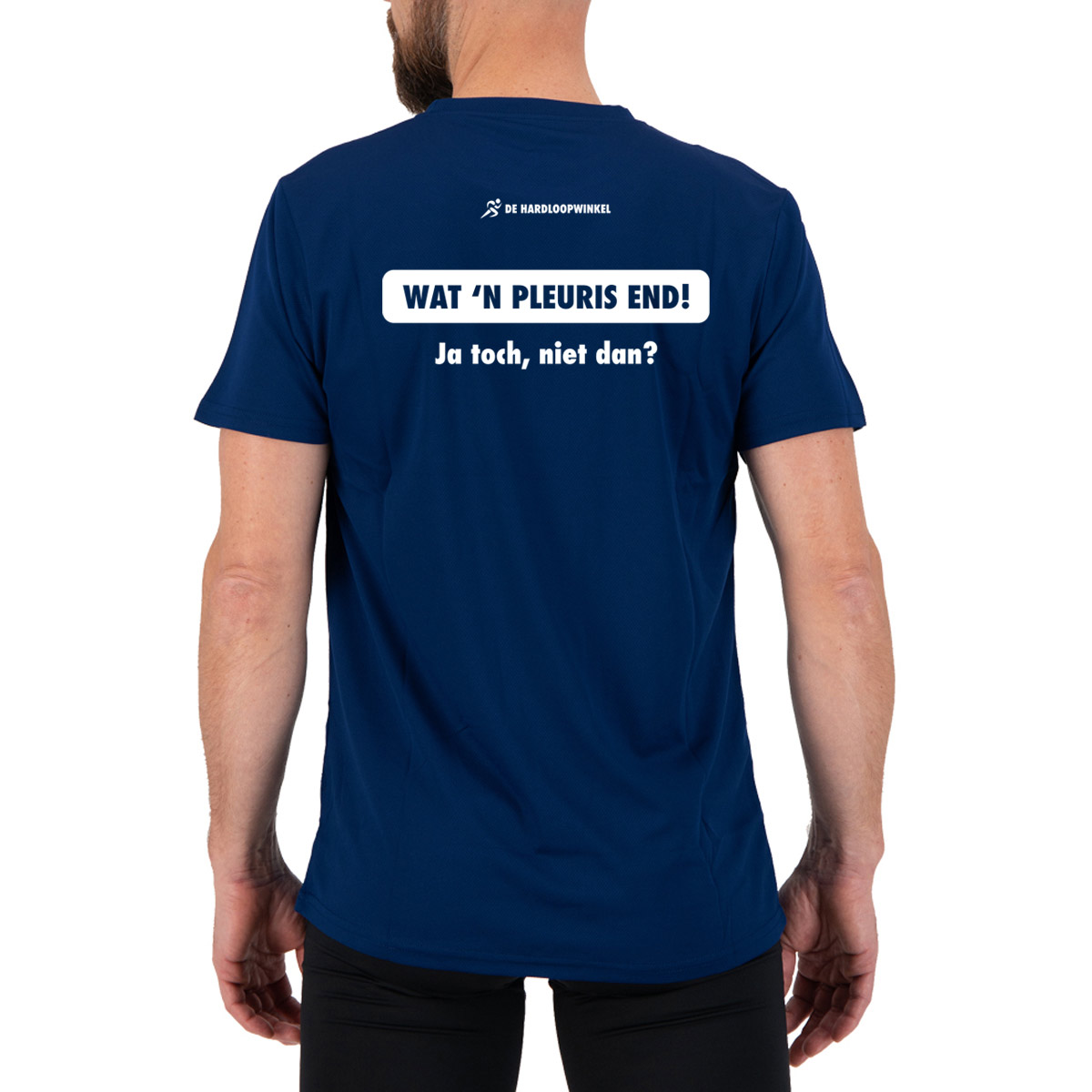 Een uniek sneldrogend hardloopshirt van Rogelli voor de heren met de tekst: 'Wat 'n pleuris end. Ja toch, niet dan?'