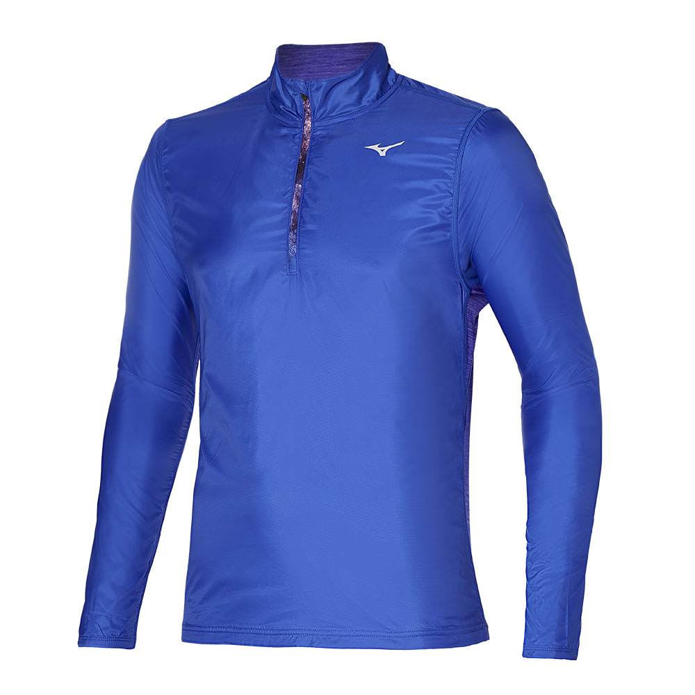 Dit Mizuno shirt lange mouw 1/2 zip Hybrid violet blue voor de heren is een lichtgewicht winter loopshirt waarbij de voorkant is gemaakt van winddichte jasstof.