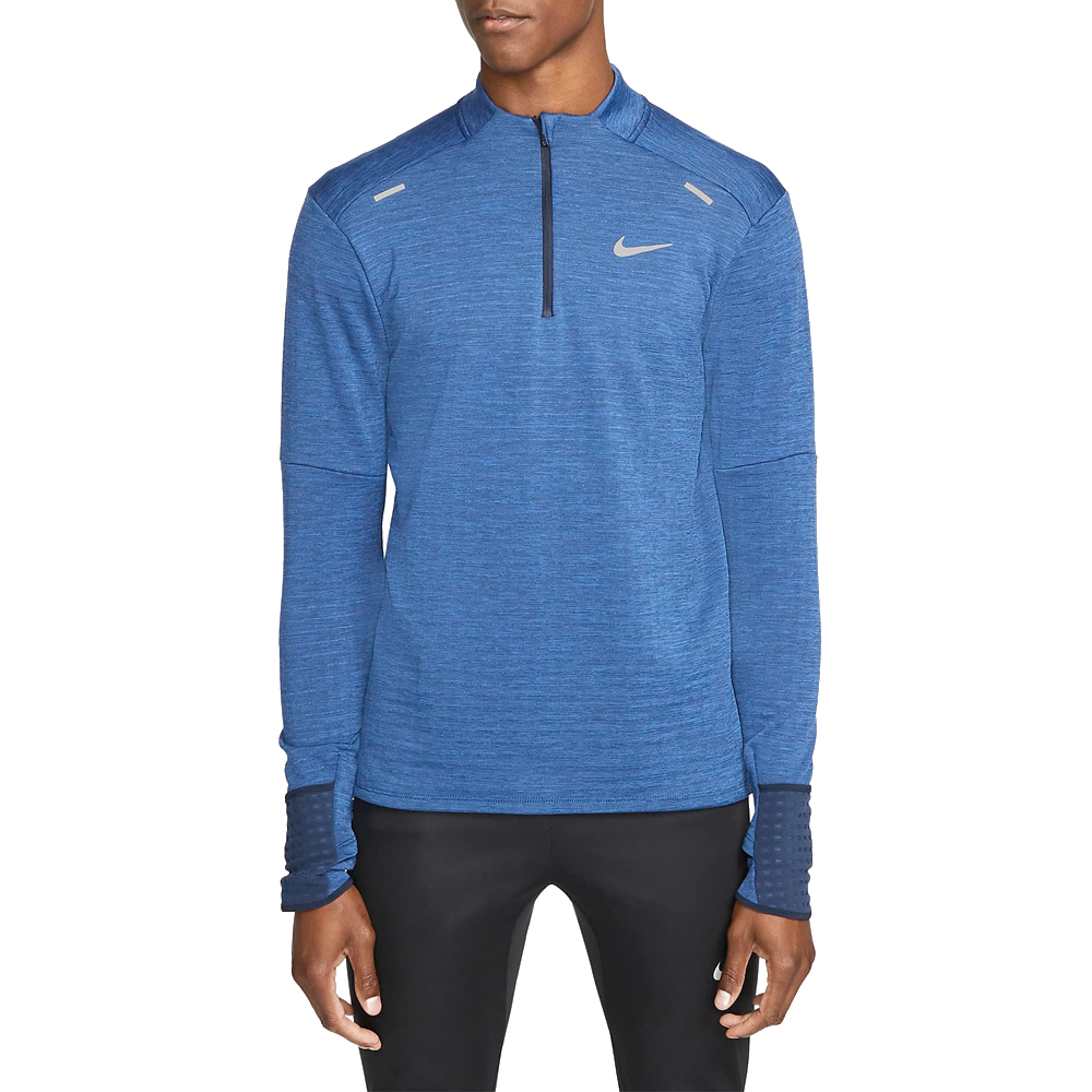 Dit Nike shirt lange mouw warm 1/2 zip Therma-Fit Repel Element blue voor heren is gemaakt van een warme, gevoerde stof met waterafstotende eigenschappen om je droog te houden. Het shirt is voorzien van een halve rits, en mouwen met duimgaten die ook als wanten gedragen kunnen worden. Door de reflecterende details ben je goed zichtbaar in het donker.
