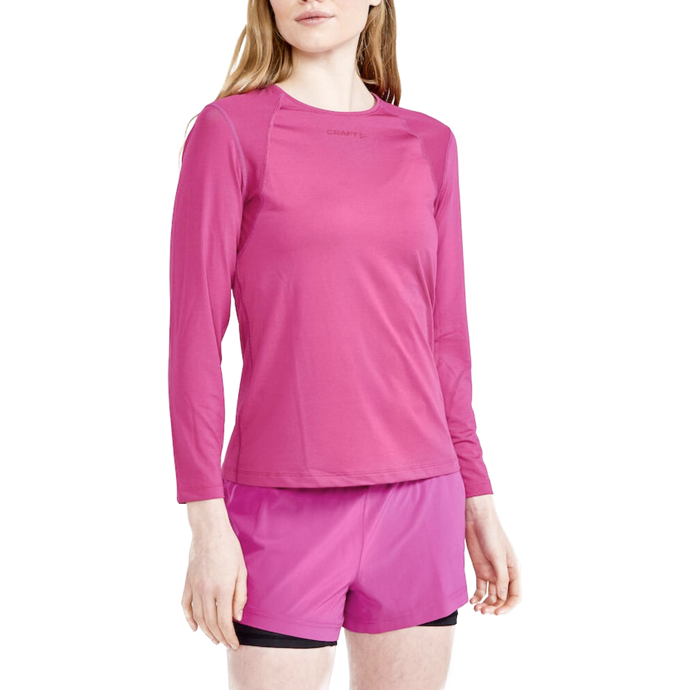 Craft lange mouw Adv Essence dk roxo voor dames heeft een getailleerde pasvorm voor optimale bewegingsvrijheid. Dit Craft hardloopshirt is ademend en houdt je cool tijdens de warme dagen. Dames t-shirt is duurzaam en gemaakt van gerecycled polyester.