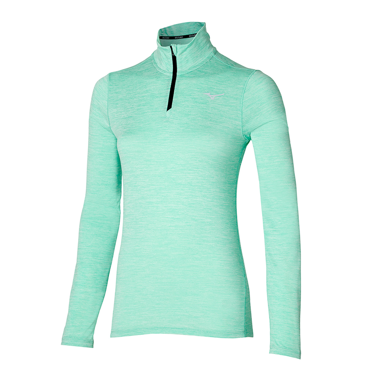 Dit Mizuno shirt lange mouw 1/2 zip Impulse Core dusty jade dames is gemaakt van een zachte dunne functionele stof met hoog ademend vermogen.