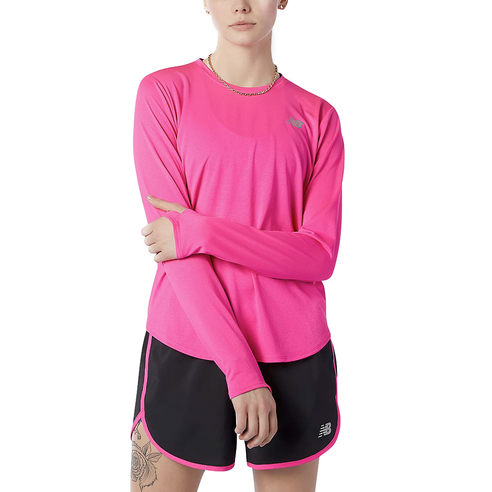 New Balance shirt lange mouw Accelerate pink voor dames is gemaakt voor het sporten tijdens alle seizoenen. Dit dames loopshirt houdt je droog en comfortabel tijdens een inspannende workout. Het lichtgewicht New Balance damesshirt met lange mouwen is gemaakt van gerecycled polygeweven materiaal.