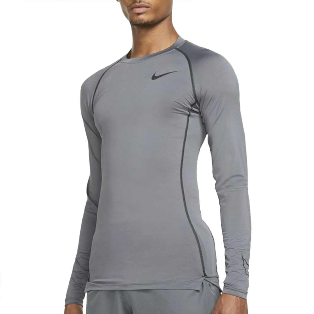 Dit Nike shirt lange mouw Pro iron grey heren houdt je koel en droog tijdens het sporten. Een lichtgewicht sportshirt met strakke fit wat je makkelijk onder een hardloopjas of als thermo ondergoed kan dragen. Het elastische materiaal is gemaakt met minstens 75% gerecyclede polyestervezels