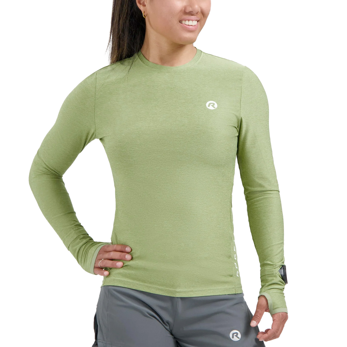 Rogelli shirt lange mouw Essential (Green) dames is gemaakt van een comfortabele en ademende en functionele Eco Dynaflow-stof. Het shirt heeft platte stiknaden en is elastisch, het beweegt met je mee tijdens het sporten. De duimgaten houden je handen warmer, terwijl het horlogevenster bij de pols het makkelijk maakt om je sporthorloge af te lezen zonder je mouw op te schuiven. Een ideaal en prettig aanvoelend sportshirt geschikt voor vele doeleinden.