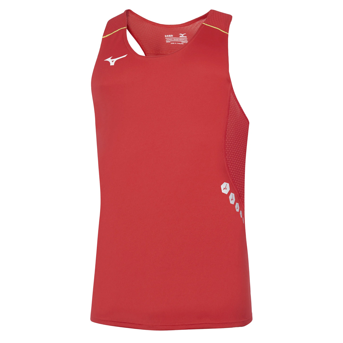 Deze Mizuno singlet Team Premium JPN red voor heren is gemaakt van een lichtgewicht, ademende stof met Drylite technologie. Jaquard mesh zij-inzetstukken voor verbeterde bewegingsvrijheid. Fluorescerende prints en logo's verhogen de zichtbaarheid voor extra veiligheid.