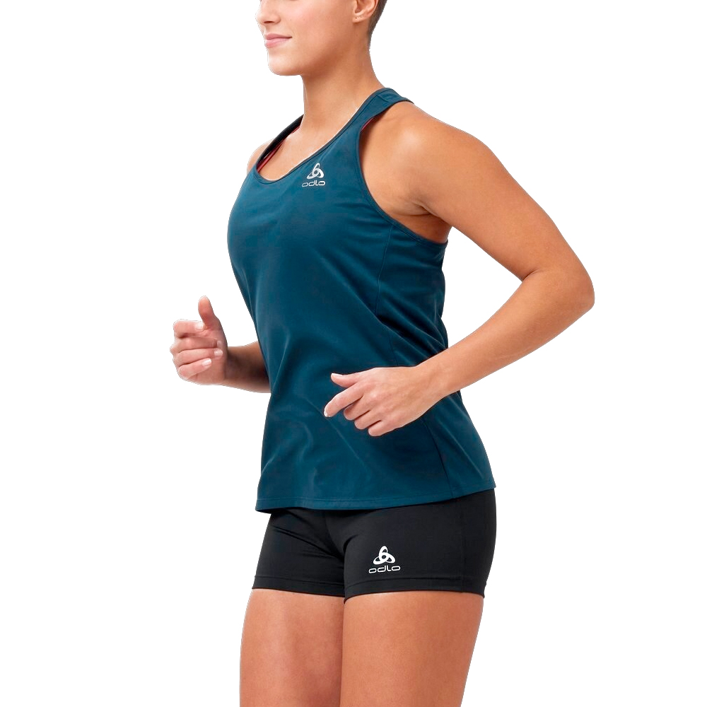 Deze Odlo singlet Essential blue wing teal voor dames is gemaakt van een lichtgewicht stof met een goede vochtafvoer. De Zero-scent technologie zorgt ervoor dat geurtjes geneutraliseerd worden.