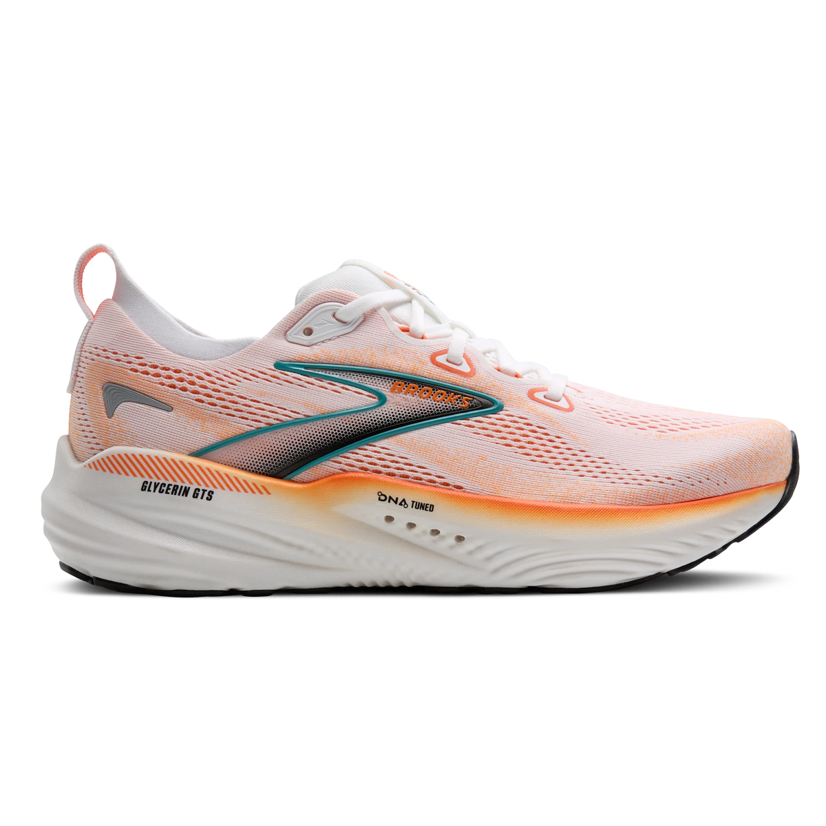Brooks Glycerin GTS 22 White/Orange/Green Blue Slate heren is één van de meest comfortabele antipronatie loopschoenen met ongekende demping van dit moment. Met een vernieuwde tussenzool voorzien van DNA TUNED schuim, dé nieuwe generatie op stikstofinfusie gebaseerd en met dubbele celtechnologie.