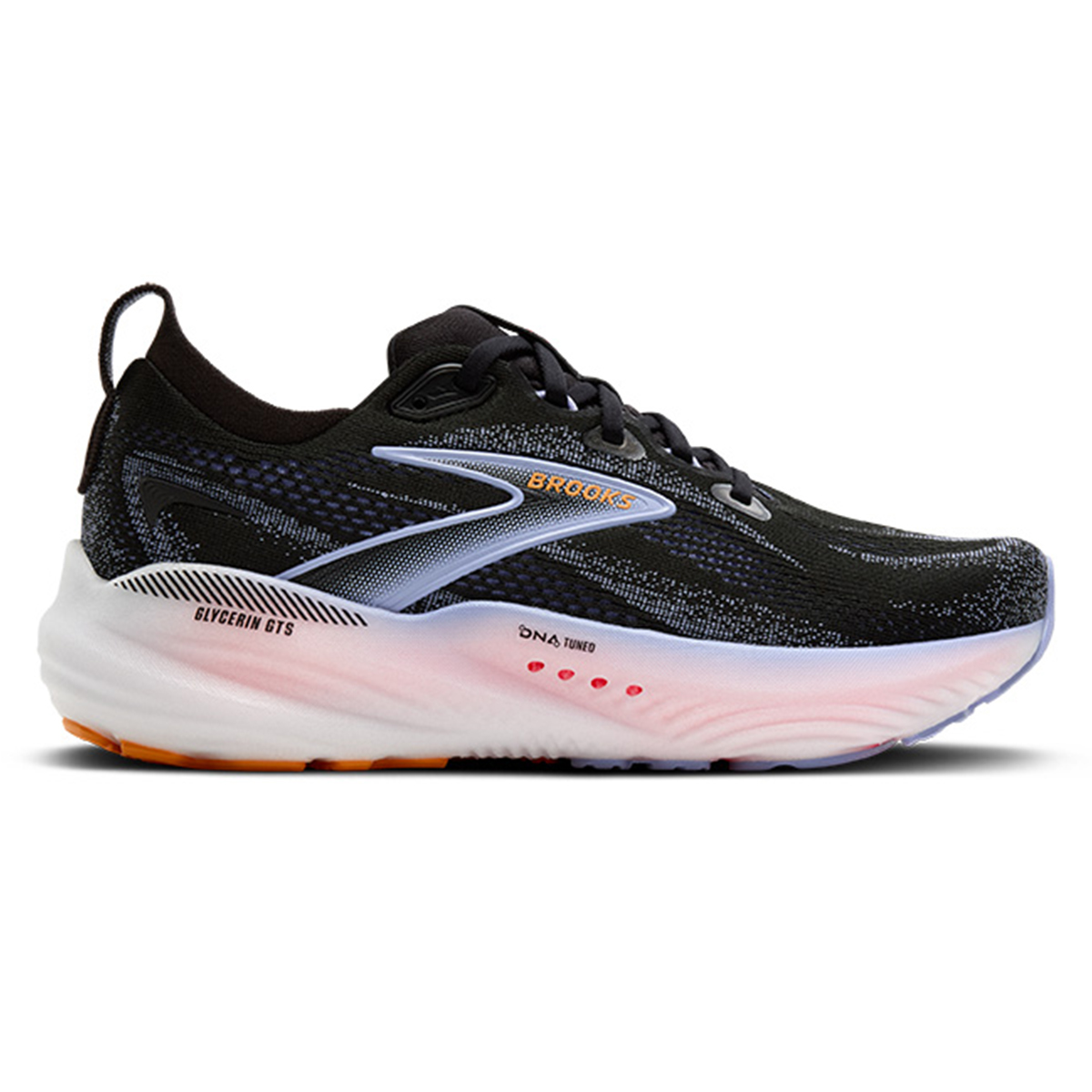 Brooks Glycerin GTS 22 (Black/Blue Heron/Orange) dames is één van de meest comfortabele antipronatie loopschoenen met ongekende demping van dit moment. Met een vernieuwde tussenzool voorzien van DNA TUNED schuim, dé nieuwe generatie op stikstofinfusie gebaseerd en met dubbele celtechnologie.