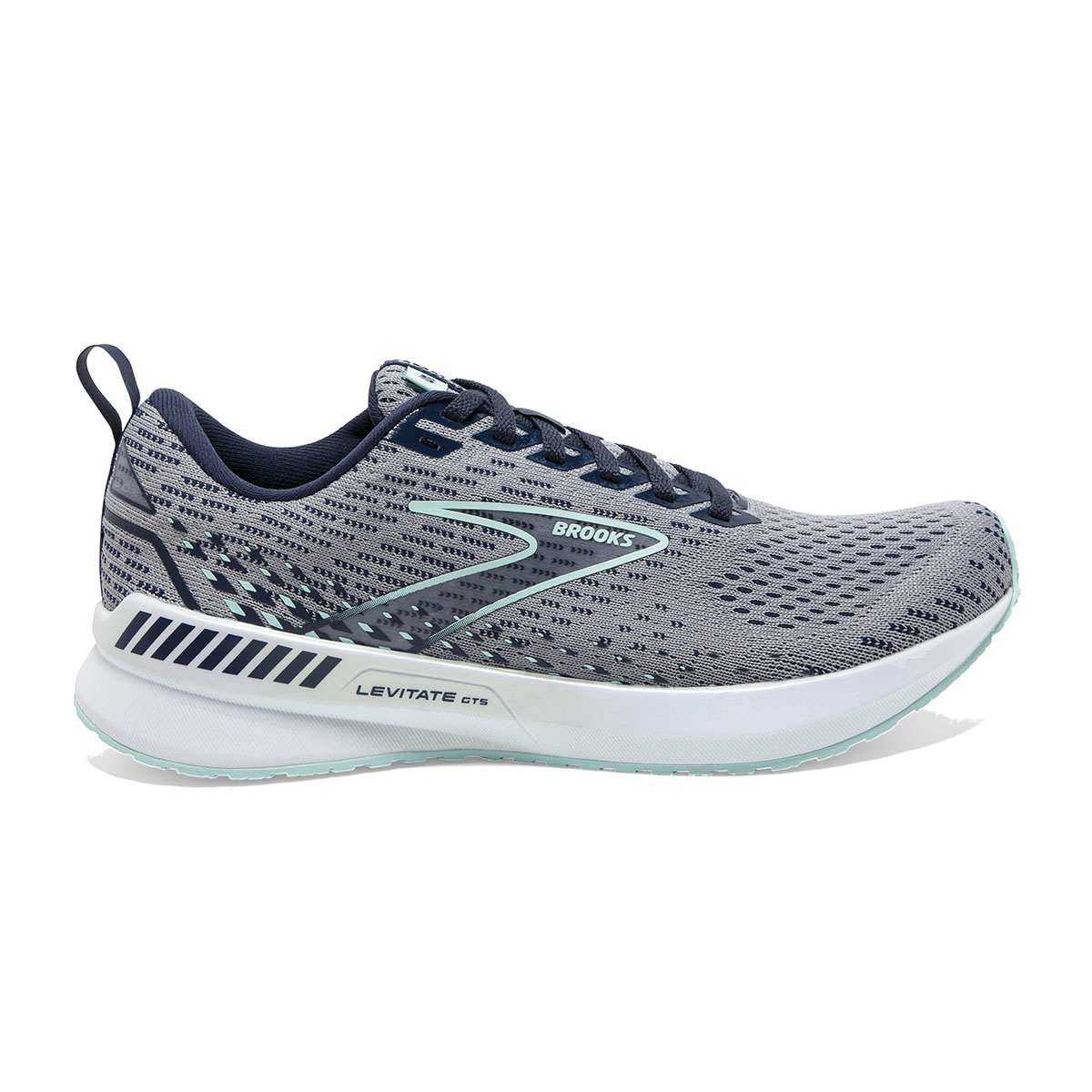 Brooks Levitate GTS 5 Grey/Peacoat/Blue Light dames zijn luxe antipronatie hardloopschoenen uit de ENERGIZE collectie