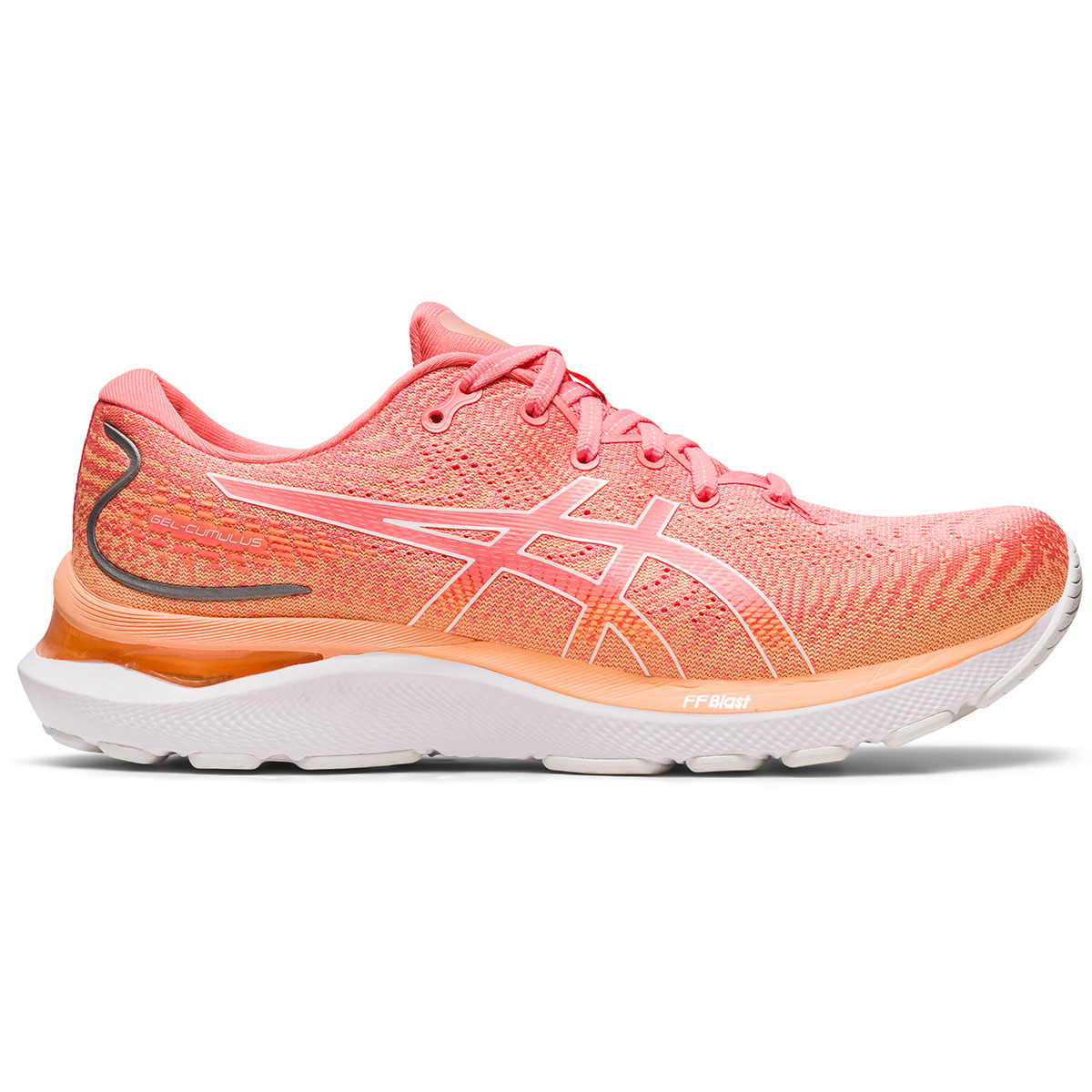 Asics Gel Cumulus 24 papaya/white dames is een neutrale hardloopschoen met een breder landingsvlak. Zo is er door de Full Ground Contact zool in de Cumulus 24 veel stabiliteit en demping. Het vernieuwe 3D-design van de tussenzool geeft een nog betere afwikkeling.