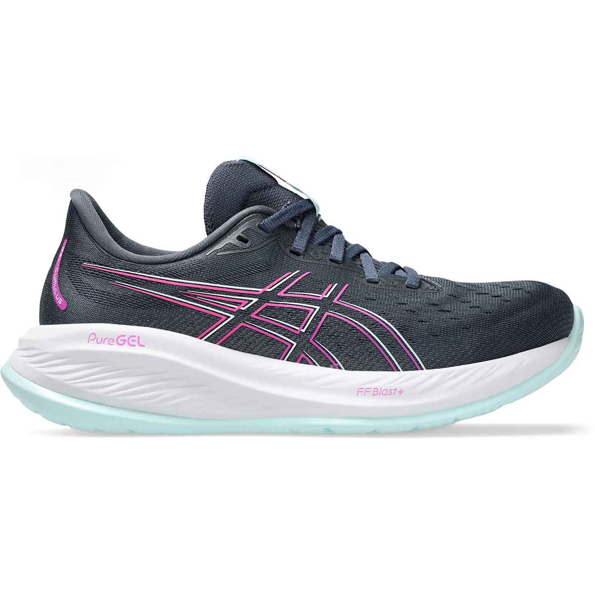Asics Gel Cumulus 26 Tarmac/Bold Magenta dames is een neutrale stabiele hardloopschoen geschikt voor vele soorten trainingen en de meest dempende en lichtste Gel-Cumulus tot nu toe. Nieuw ontworpen middenzool met FF BLAST PLUS gecombineerd met een FluidRide buitenzool voor zachte landingen en soepele overgang. Pure-Gel technologie voor meer zachtheid en minder impact op de gewrichten.