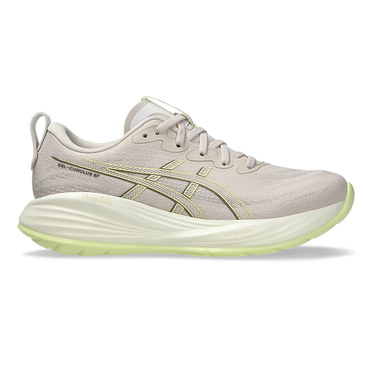 Asics Gel Cumulus 27 (Beige/Huddle Yellow) dames is een super lichte allround neutrale hardloopschoen. Ideaal voor hardlopers die houden van een soepel en licht gevoel aan hun voeten.