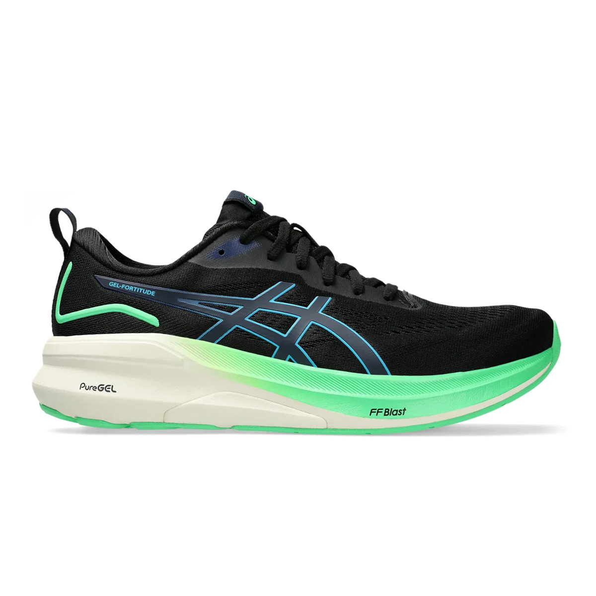 Asics Gel Fortitude Black/Digital Aqua stabiele neutrale allround hardloopschoen, terug van weggeweest. Ervaar stabiliteit en demping in deze comfortabele loopschoen. Stabiliteit is een van de belangrijkste kenmerken ondanks dat het geen antipronatieschoen is. De vlakke leest en bredere basis in combinatie met het LITETRUSS™-ondersteuningssysteem maakt deze neutrale hardloopschoen ook geschikt voor licht pronerende lopers.