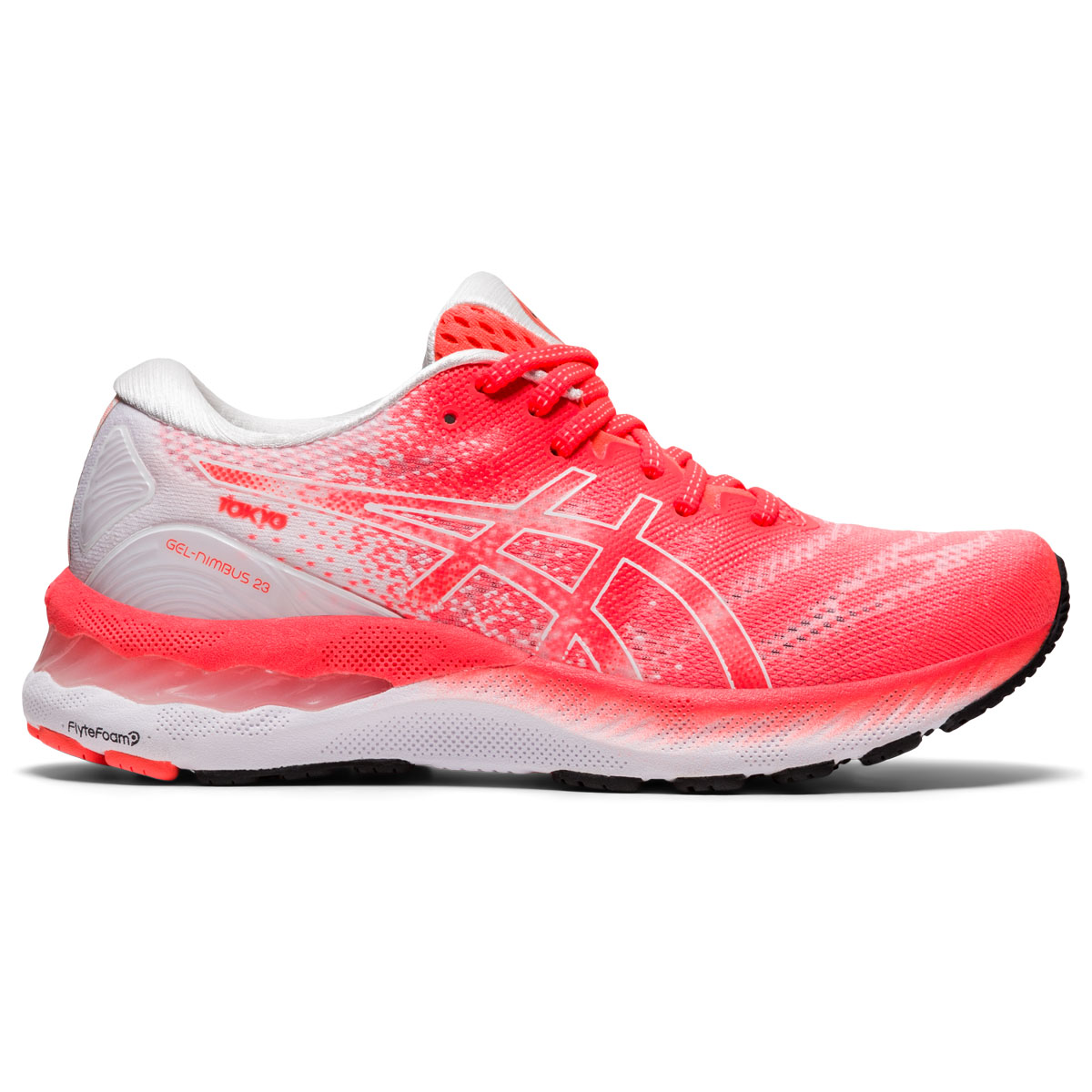 De ASICS GEL NIMBUS 23 sunrise red/white dames