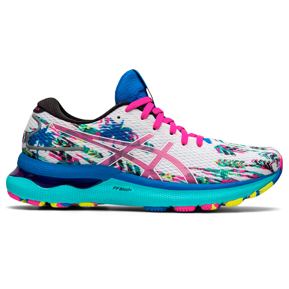 ASICS Gel Nimbus 24 white/pink glo color injection is een neutrale dames loopschoen met subliem comfort en demping.