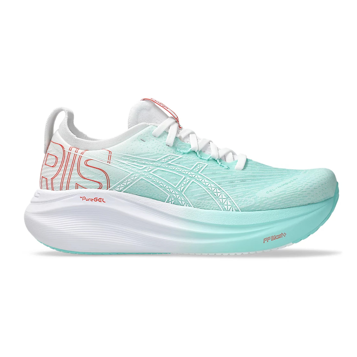 Asics Nimbus 27 (Mint/White) dames de nieuwste evolutie op gebied van stabiele supercomfortabele neutrale hardloopschoen. Met 2 mm extra stackhoogte van FF BLAST™ PLUS ECO-demping om het luxe comfort naar hogere hoogte te tillen. Nieuw engineerd jacquard mesh bovenwerk voor betere ventilatie, voel comfort tijdens je run en vindt je rust.