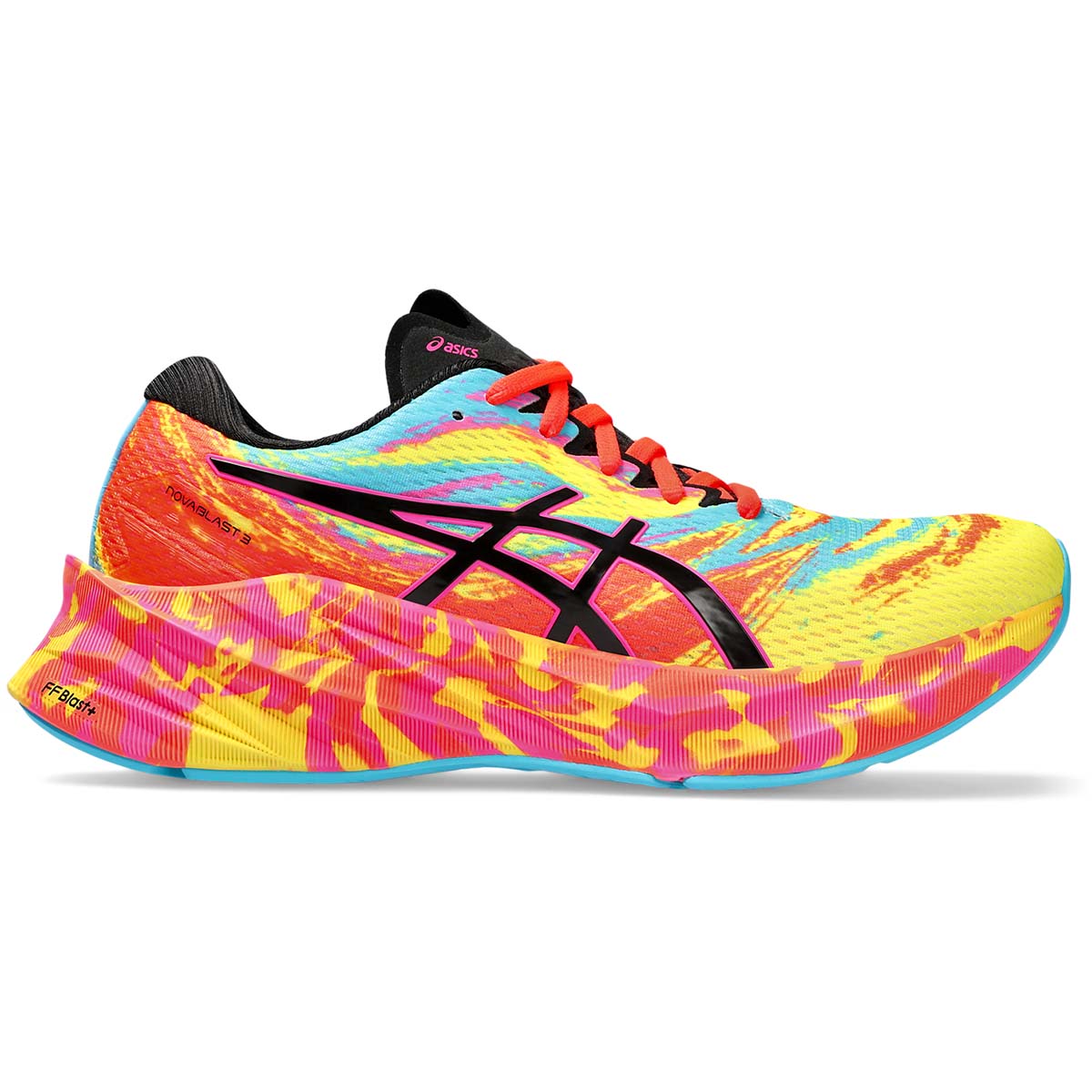 Asics Novablast 3 Aquarium/vibrant yellow dames zijn neutrale hardloopschoenen met de FF BLAST tussenzool. Deze nieuwe zool en bovenwerk is geïnspireerd op geometrische origami. Geschikt voor hardlopen op de weg en loopwedstrijden.