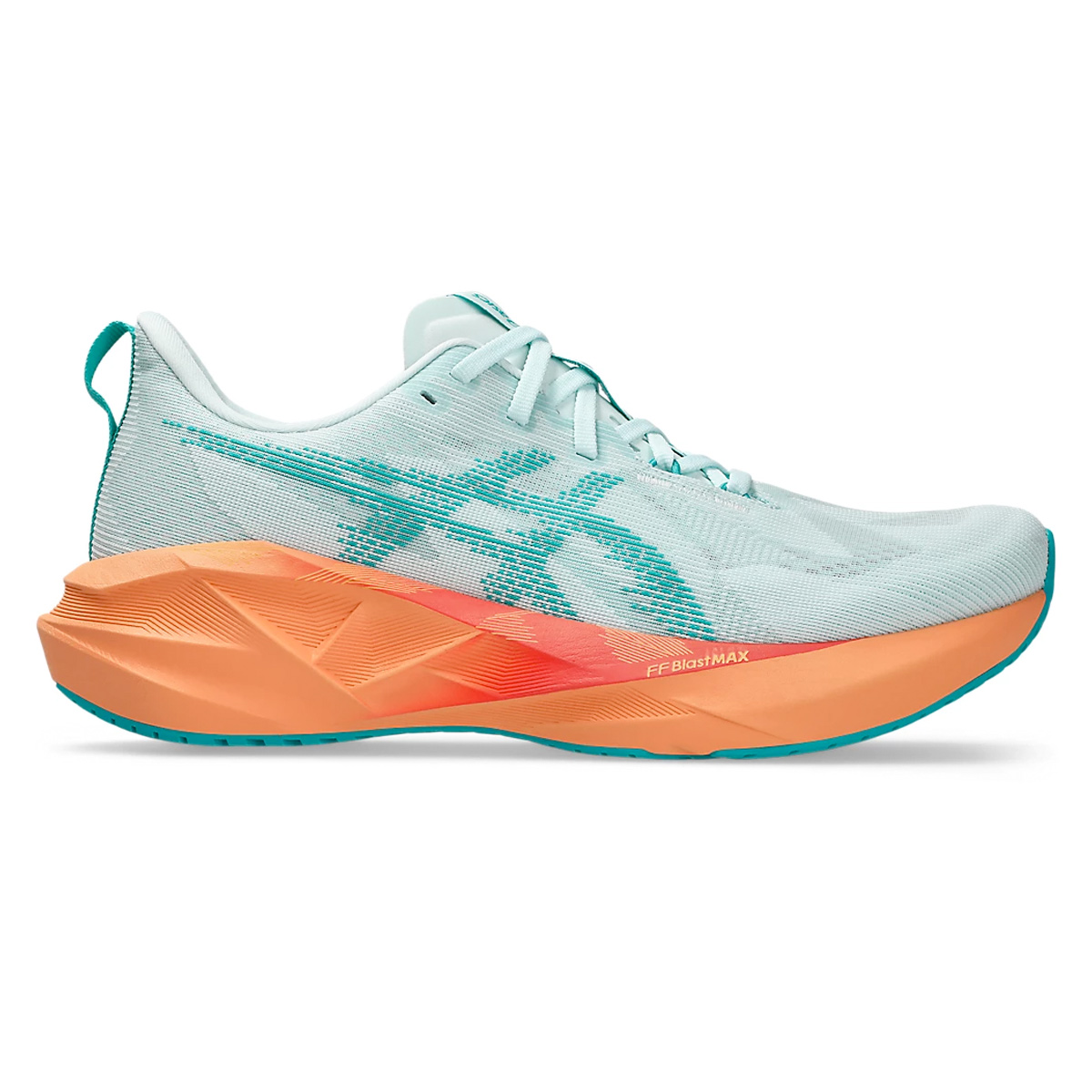 Asics Novablast 5 Soothing Sea/Wave Teal heren is een neutrale lichte hardloopschoen met bijzonder hoge veerkracht en energieteruggave. Geschikt voor zowel rustige duurtrainingen als de snelle tempo's! Met FF BLAST MAX demping en het unieke geometrisch design in zowel tussenzool als buitenzool ervaar je een top combinatie tussen comfort en energieke passen.