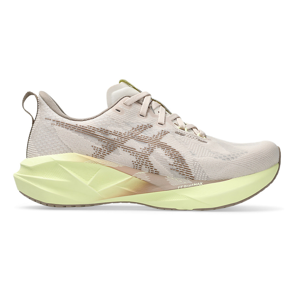 Asics Novablast 5 Mineral Beige/Taupe Grey dames is een neutrale lichte hardloopschoen met bijzonder hoge veerkracht en energieteruggave. Geschikt voor zowel rustige duurtrainingen als de snelle tempo's! Met FF BLAST MAX demping en het unieke geometrisch design in zowel tussenzool als buitenzool ervaar je een top combinatie tussen comfort en energieke passen.